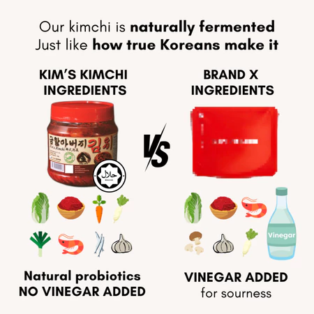 Enjoy the famous Korean flavour with Kim’s Kimchi, now certified HALAL JAKIM — perfect for Muslim consumers who love spicy Korean food. Made from fresh cabbage (kobis), chili, garlic, and Korean seasoning, this kimchi is crunchy, sour, spicy, and deliciously addictive.