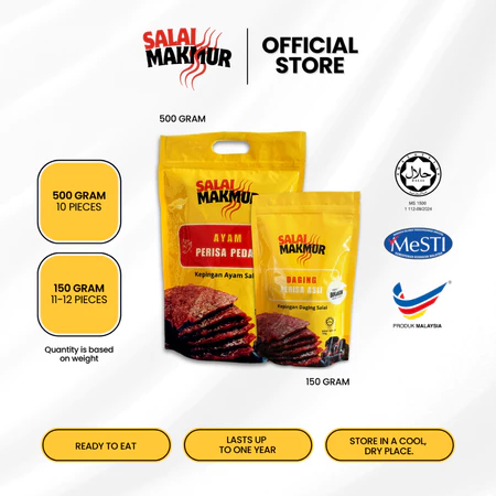 Nikmati rasa tradisi dengan Kepingan Daging Salai Makmur, diperbuat daripada daging berkualiti tinggi yang disalai perlahan untuk menghasilkan rasa yang wangi, beraroma dan sangat menyelerakan. Datang dalam dua pilihan perisa — Pedas dan Original, sesuai untuk semua citarasa.